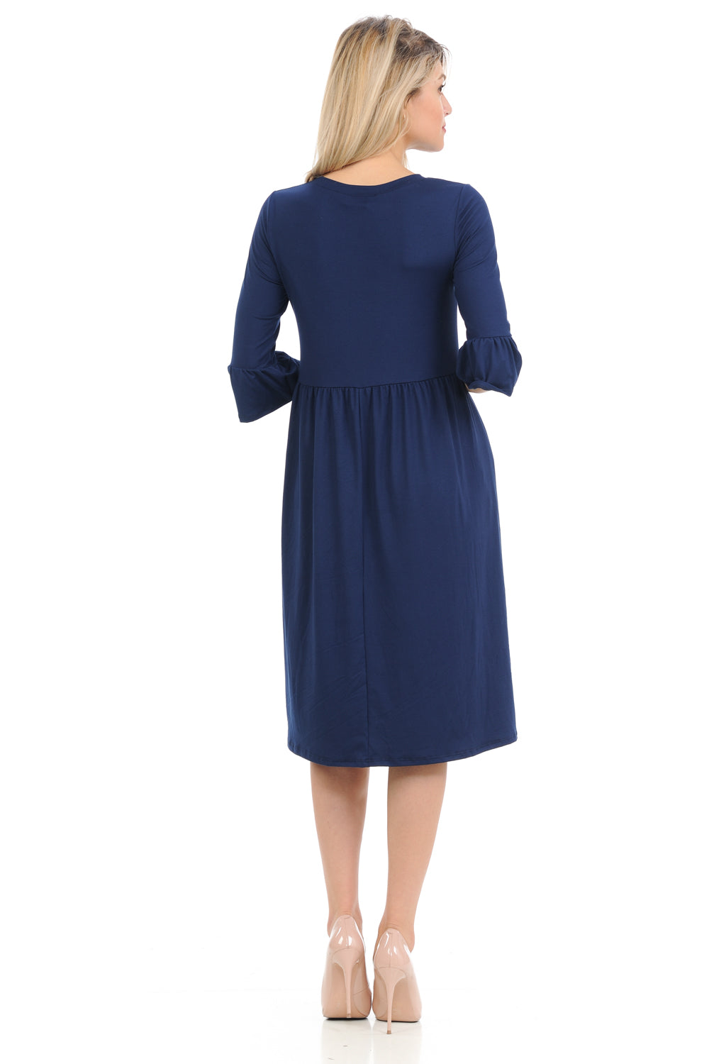 - Dress features three-quarter sleeves with ruffle detail, rounded neckline, midi length, figure flattering A-line silhouette and convenient side pockets. It is made of soft brushed DTY knit.